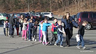 Children are led to safety after the 2012 shootings at Sandy Hook Elementary School