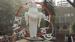A Dhaka statue of a mother holding her dead child, killed in the 21 February protests.The words spell out 'mother tongue'.