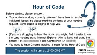 A quick glance through the participant list at the end of the first course showed we had a few people drop out of the session. We knew they could see the trainer’s screen but they didn’t have audio for one reason or another. Because we asked delegates to download Chrome for the Hour of Code puzzles, we think Lync didn’t launch properly because it requires Internet Explorer.
