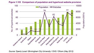 Research suggests that much hyperlocal activity is focused on conurbations such as London and Birmingham. But Ofcom has also noted: “Some rural areas were well served, with South Gloucestershire having 11 sites, largely aimed at small towns and villages, and Wiltshire having 10.” Alongside this, areas such as the North East of England, the East Midlands and the devolved nations appear to be disproportionately underserved by hyperlocal.