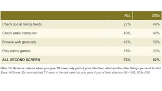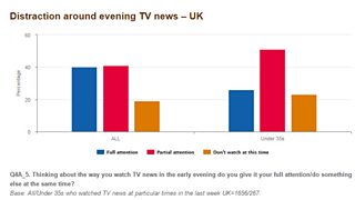Even when watching TV, the second screen can be a distraction to attention. Half of those who watch TV news said they are regularly distracted by other things (higher amongst under-35s) and eight in 10 under-35s (82%) said this distraction is from a second screen (emails, social media, web browsing).