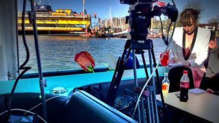 Nick Woolley, a BBC cameraman more familiar with war zones than royal river pageants, turned his immense dexterity to setting up our portable studio in a corner of the boat; surrounded by (genuinely) dancing Dutch policemen who were equally intrigued by the technology.