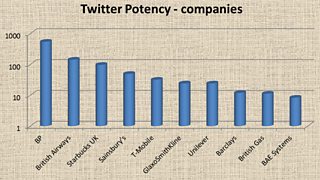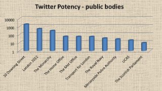 Here I’ll compare my results from the Twitter accounts of journalists and celebs with those of big companies and public bodies, to see how efficiently each group appears to be building those channels. In all cases the accounts I’ve picked are somewhat arbitrary but, I’d hope, among the top examples of their field.