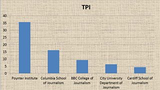 But of course they are bigger bodies than us and not in the same sector. So here’s how we rate against the Twitter accounts of the Cardiff School of Journalism, Department of Journalism, City University, The Poynter Institute (US) and Columbia School of Journalism (US):