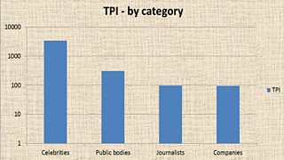 Taking the average TPI for my four categories, celebrities, perhaps predictably, are far ahead (so again I’ve used a logarithmic scale):