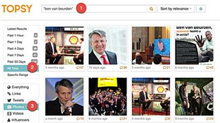 You can use www.topsy.com to find out where your subject was (top image) by analysing his mentions (1) over time (2) and by looking at the photos (3) that others posted on Twitter. If you’d rather research a specific period, go for “Specific Range” in the time menu.