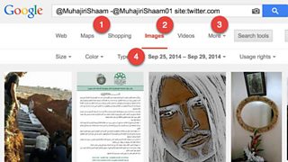 Combine all you know about your subject in one mighty phrase. In the below example I’m searching for a jihadist known as @MuhajiriShaam (1) but not the account @MuhajiriShaam01 (2) on Twitter (3). And I just want to see the photos he posted on Twitter between 25 September and 29 September 2014 (4).