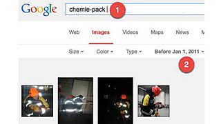 Go to images.google.com, type in Chemie-pack (1) and just search before January 2011 (2). The results offer hundreds of photos from a youth group that visited the company days before the fire. In some photos you can see barrels with names of chemicals on them. We used this to establish some of the chemicals that were stored in the plant days before the fire.