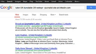 Say you’re looking for journalists who work in the wider Luton area. By putting “OR” (always in caps) between places in that area you can search for each and/or all of your entries eg. “luton OR dunstable OR welwyn ~ journalist”. Inserting the squiggle sign or ‘tilde’ before “journalist” ensures that you’ll get a wider trawl for writers, reporters, editors etc - so synonyms of journalist too.