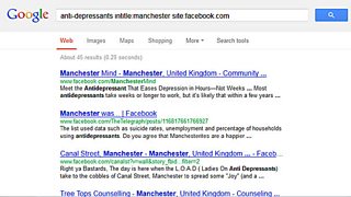 Another operator worth getting acquainted with is “intitle”. Say you want to find Facebook groups about Prozac or Valium based in the Manchester area. If you type into Google “Manchester anti-depressants site:facebook.com”, you may get groups of people taking Prozac but you’ll also get groups of pharmacists. You might also turn up the likes of ‘Dave Manchester’.