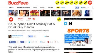 Buzzfeed’s So, a Python Didn’t Actually Eat a Drunk Guy in India debunk took about five seconds using a Google reverse-image search, said Lewis, who recommended Topsy as another debunking aid.