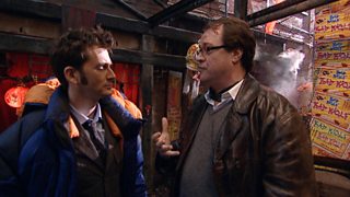 Seen above with the Tenth Doctor, David Tennant, during the shooting of Turn Left (which is repeated tonight on BBC Three!), Russell recently returned to Cardiff for Wizards Vs Aliens. The new show is being filmed for CBBC at Roath Lock and follows the adventures of two boys - a secret wizard and his scientist friend - as they attempt to thwart hostile aliens. Russell described his new series as 'a wild, funny, thrilling and sometimes scary collision of magic and science fiction.'