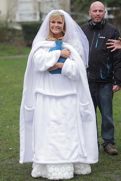 Jo Joyner keeps warm outside with a hot water bottle and a rather prestine dressing gown.