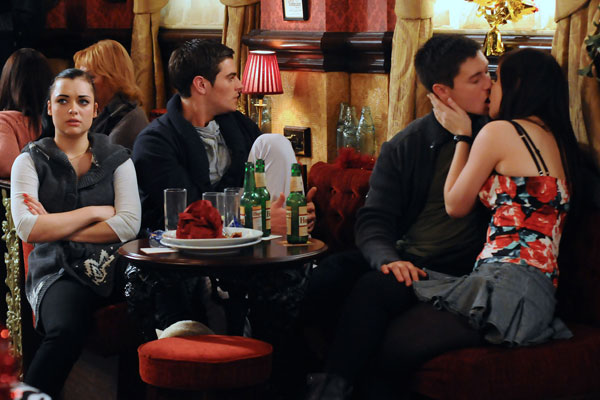 While having a quick drink in The Vic, Lauren kisses a very willing Tyler. During this seemingly awkward moment, poor Anthony doesn't know where to look and Whitney clearly has a touch of the green-eyed monster! Uh Oh!