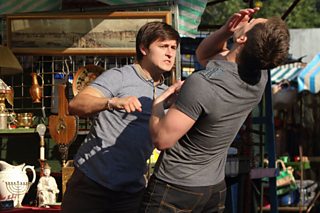 Poor Tyler is having to take orders from the new Emporium owner - Derek. Plus, his big bro Anthony has left him high and dry. So, when Joey starts to wind him up he loses it and.. well.. the picture speaks for itself!