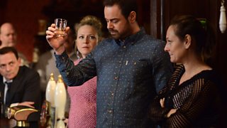To lighten the mood, Mick raises a glass for Stan, but a drunken Shirley shows up - and things soon turn sour again...