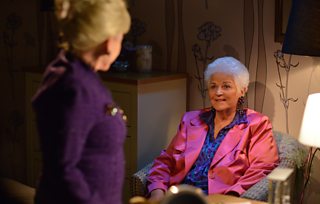 As everyone knows, it was last orders for Peggy Mitchell last night (Tuesday 17th May). For obvious reasons, we had to hold back these pictures of a surprise appearance by an old favourite. Pat returned, in ghostly form, to send Peggy on her way.