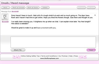 Just as love was blossoming online with Kevin68, he fled the world of cyber space. Perhaps his Amazing bond with Hev just got Too Funky and he had to go Outside for air? *Smiles apologetically*.