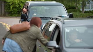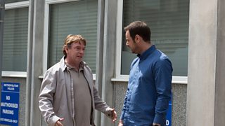 His plan backfires when Mick, who’s drivng home from the pool, spots him and pulls over. Ian panics and speeds off in his car, leaving Mick in a compromising position!