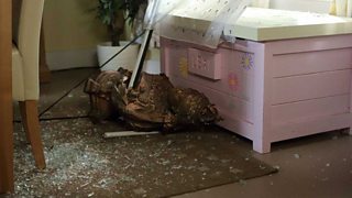 Understandably, this doesnt go down too well with Alfie and after he leaves, Phil and Roxy hear a massive crash... and see The Queen Vic bust has been chucked through the window.