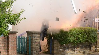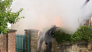 He hot foots it back to the house, but just as he arrives, theres a HUGE explosion.