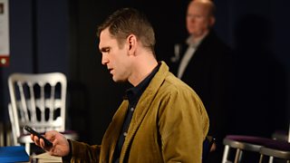 Sparks soon start to fly, as the boys bicker, and Phil relishes the secret of his recent kiss with Sharon. The tension rises further when Jack's phone rings and Phil sees it's a call from Ronnie. Outside, panic ensues as people start to realise the mix-up, and Sharon's fears go into overdrive as she tries to open the door. Can she get them out before secrets, or blood for that matter, start to spill!