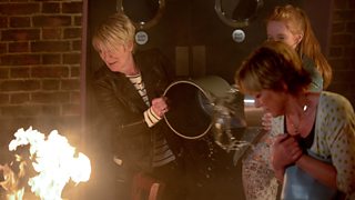 Courtesy of some candles and an expensive bottle of Ian's brandy, the restaurant is soon aflame! Thankfully, the girls act fast enough - well, after a fit of panic, and manage to extinguish the fire with a bucket of water.