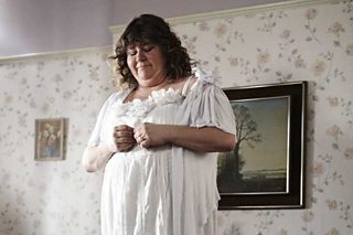 Heather gets all teary-eyed as she tries on her second-hand wedding frock. Cheer up love, your dream dress could be in the post. Failing that a role in the sequel to the Woman in Black could be yours.