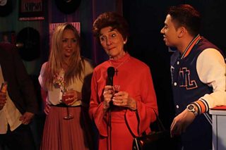 What's this? Dot in R&R? Has the recession hit so hard they've launched a grab a granny night? Fear not, it's the night of Heather's Hen Night and Dot decides to raise a glass to the happy couple.Let's hope someone takes the microphone off her before she's tempted to sing.