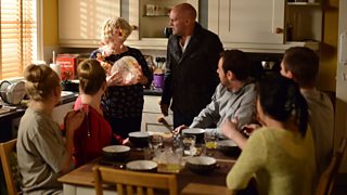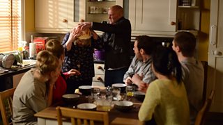 After learning the truth about the incident at Blades, an angry Buster storms over to The Vic to confront Aunt Babe. Livid, Buster grabs her famous trifle and pours it over her head!