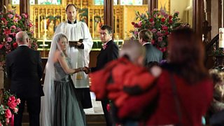 In a church across town, Alfie stall the proceedings as he panics. He finally confesses the truth about his kiss with Kat to Ian, but Ian persuades Alfie that Roxy is the right woman for him (but, come on, would you take romantic advice from Ian Beale?)