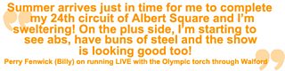 Talking of his upcoming relay, Perry Fenwick, aka, Billy said "Summer arrives just in time for me to complete my 24th circuit of Albert Square and I'm sweltering! On the plus side, I'm starting to see abs, have buns of steel - and the show is looking good too!"