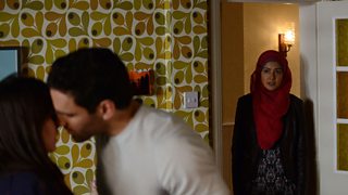They struggle to resist each other - and as they lean in for a kiss, an upset Shabnam arrives after an argument with her father. The question is, does she see anything?
