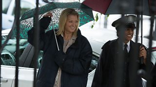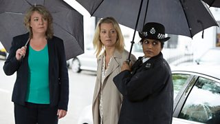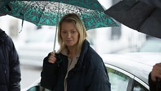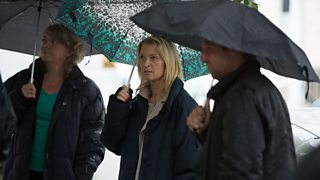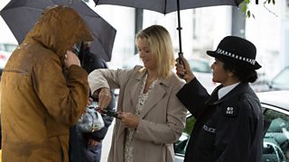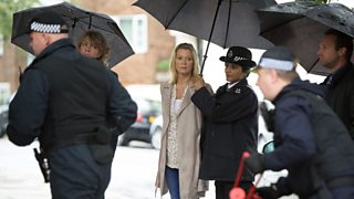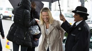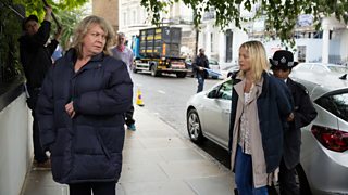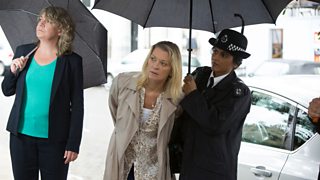 Gillian Taylforth and Sophie Stanton braved the wet weather to film scenes of Kathy getting cuffed for an upcoming episode.