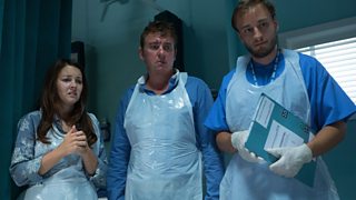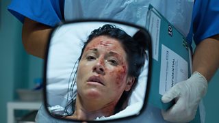 Photo spoiler: Face the consequences Wednesday 24 September 2014, 22:02 EastEnders News TeamCommentsKat makes the brave decision to remove the bandages from her face so that she can see the scars. Alfie and Stacey are both there to offer support...How will Kat react when she's handed the mirror? This episode will be on screen toniht, 25th September.