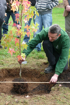 Begin by stripping off the turf or surface vegetation over an area of about 1m (39in) diameter. Dig a pit in the centre of the stripped area which is at least 15cm (6in) wider and deeper than the root system of the tree or its container. Heap the soil from the pit on a polythene sheet. In soils which have either a high clay content or are extremely free-draining, mix into the soil some well-rotted organic material such as leaf mould or garden compost.