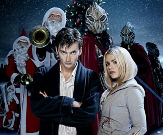 The Doctor and Rose battled robot Santas and the alien Sycorax in The Christmas Invasion, 2005, the first of a run of regular Christmas episodes of Doctor Who.