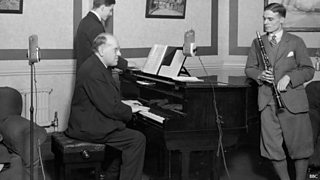 Sir Walford Davies at the piano. Plus fours were compulsory for clarinet players in the 1920s for acoustic reasons.