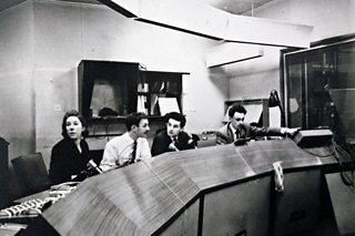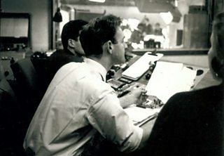 Maurice Kanareck (in white shirt) directing in Pres A, one of the presentation studios at Television Centre, in the mid-60s