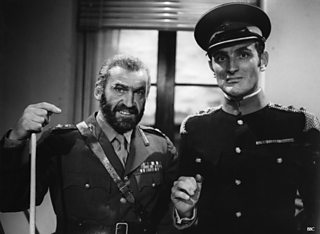 Guest Patrick Troughton and star Gerald Harper in the Adam Adamant Lives! episode, D for Destruction. Rediscovered in 2003 in the BBC Archives, it was shown at Missing Believed Wiped