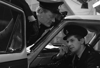 PCs Bob Steele (Jeremy Kemp) and Bert Lynch (James Ellis) who appeared in the returned Z Cars episode Family Feud, are seen here in the cut-down Ford Zephyr used for studio scenes