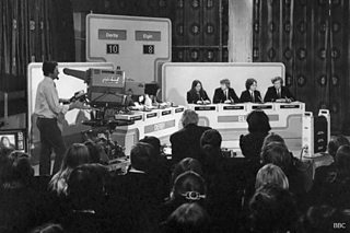 Recording the 1973 Television Top of the Form final between Derby and Elgin, with BBC outside broadcast cameras.