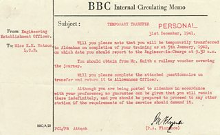 Attitudes began to change too. In his book, What Did you Do In the War, Auntie?, Tom Hickman writes that it was a period in which the BBC stopped requiring the resignation of women upon marriage, (although a memo sent out by the Corporation to its staff still insisted that women – married or not - wear stockings). It was during this time that Kay was first employed by the BBC in November 1941, at the age of 21, one of 800 women to be recruited and trained by BBC Engineering over the course of the war. In total, by 1945, half of the BBC’s entire staff were women.