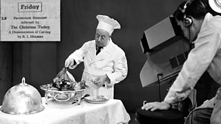 What better way to kick-start the Christmas Day programming for the few and lucky television viewers than... a live demonstration of turkey carving at 3:15pm, pictured above, followed by a newsreel and a talk by Edward Shackleton about his Lonely Christmas in the Arctic.