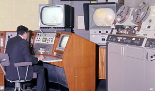 A BBC videotape suite in 1968 operated by a man in a BBC videotape suit (very comfortable but you have to keep it away from magnets)