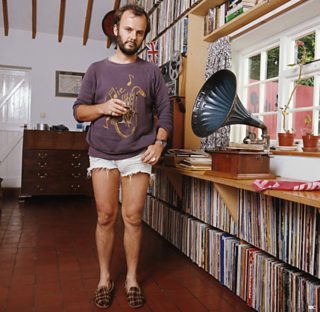 John Peel demonstrates that if you have a very large record collection, it can be hard to also afford the latest hi-fi equipment.