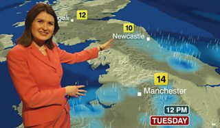 Helen Willetts presents a weather forecast using the digital map first seen in 2005. Startling news, it will be raining in Manchester