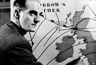 George Cowling, the first meteorologist from the Met Office to present a television weather forecast, in 1954. Here he is seen drawing a face on Cardiff