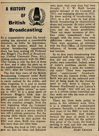 His book The Birth of Broadcasting was reviewed for the Radio Times in 1961