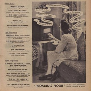 Woman's Hour first went on air in the Light Programme on October 7th 1946. It made it to the cover of the magazine, and a feature inside explained the programme would include "talks on household management, cookery, fashion, beauty culture, child care, housing, and pensions." The presenter was Alan Ivimey, a "London-born journalist who specialises in writing for and talking to women" - he was replaced three months later by Joan Griffiths.